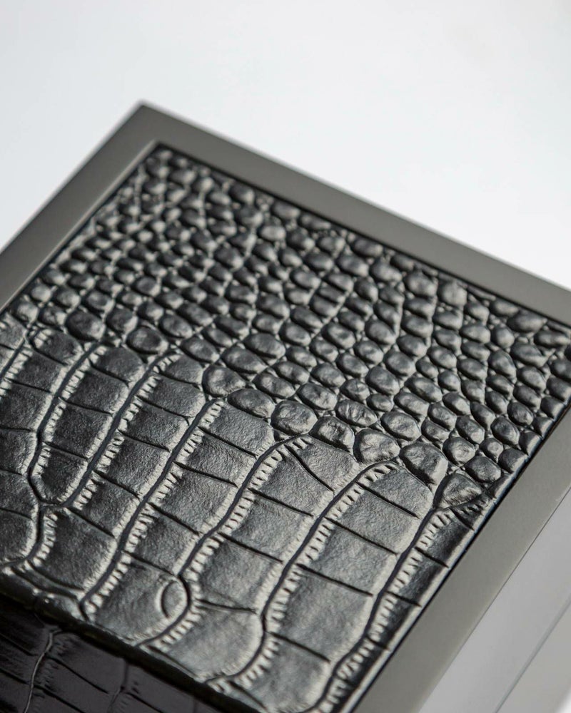 クロコ調の型押しレザーで装飾された、ラグジュアリーなダイヤモンドローズボックスです。