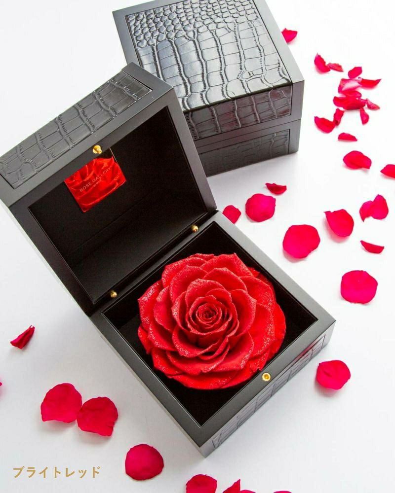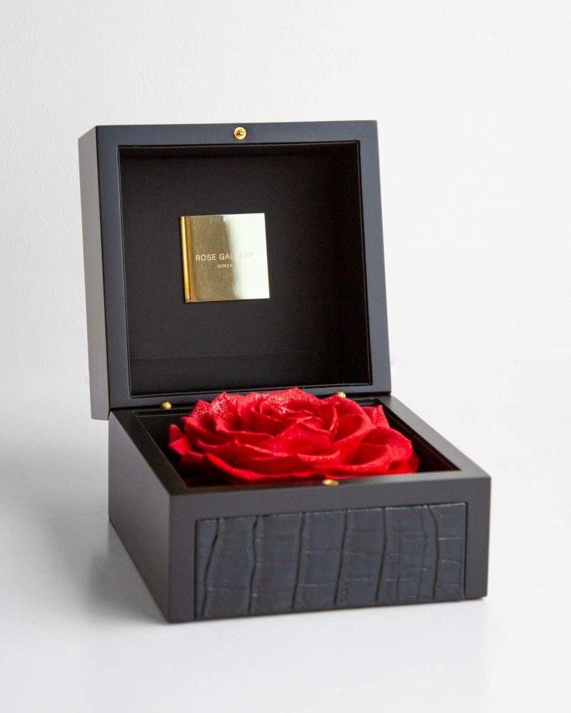 • 内容:プリザーブドフラワー(ダイヤモンドローズ) / ボックス(ウッド/カーフレザー ※エンボスクロコ型押し) / メタルプレート2枚(化粧箱・フタ内面) / マグネット(底面) / 紙製化粧箱  / 専用ショッパー(紙袋)