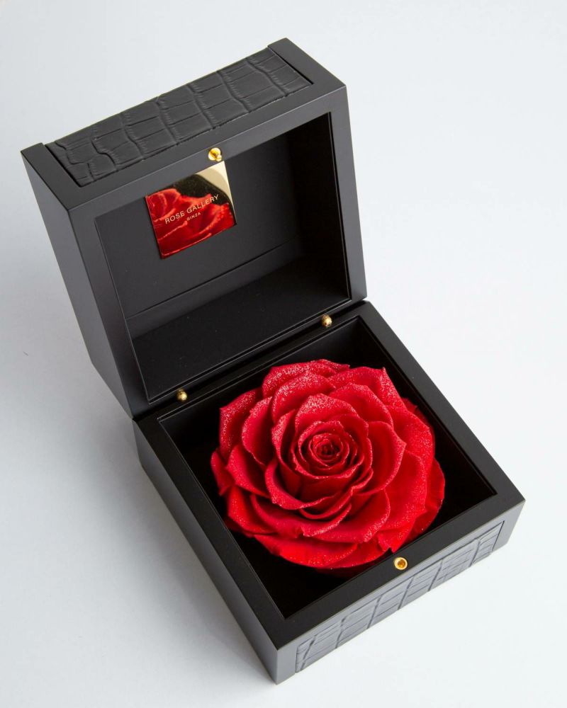クロコ調の型押しレザーで装飾された、ラグジュアリーなダイヤモンドローズボックスです。