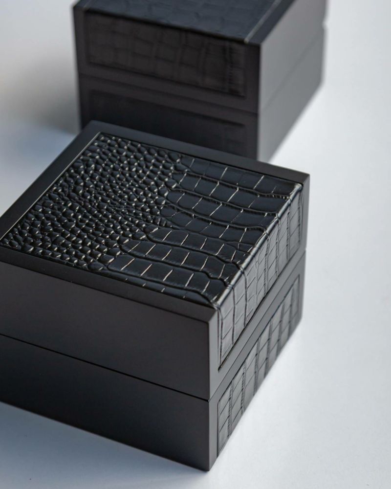 クロコ調の型押しレザーで装飾された、ラグジュアリーなダイヤモンドローズボックスです。