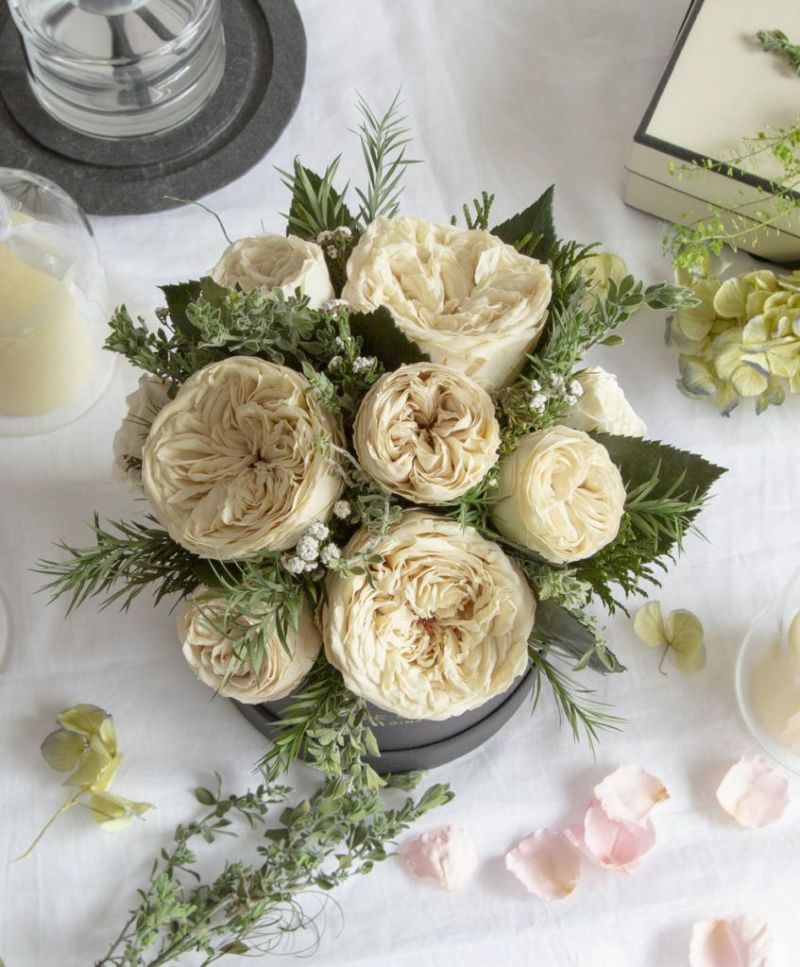 希少なオールドローズだけで仕上げた贅沢なアレンジメント「アリア」。オールドローズの魅力はなんといってもその クラシカルなロゼット咲きにあります。愛らしい複雑な花弁1枚1枚に、光りがあたった瞬間のキラメキと風になびくよ うな自然で軽やかな姿で、見る人の心を穏やかにしてくれます。