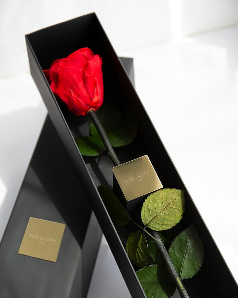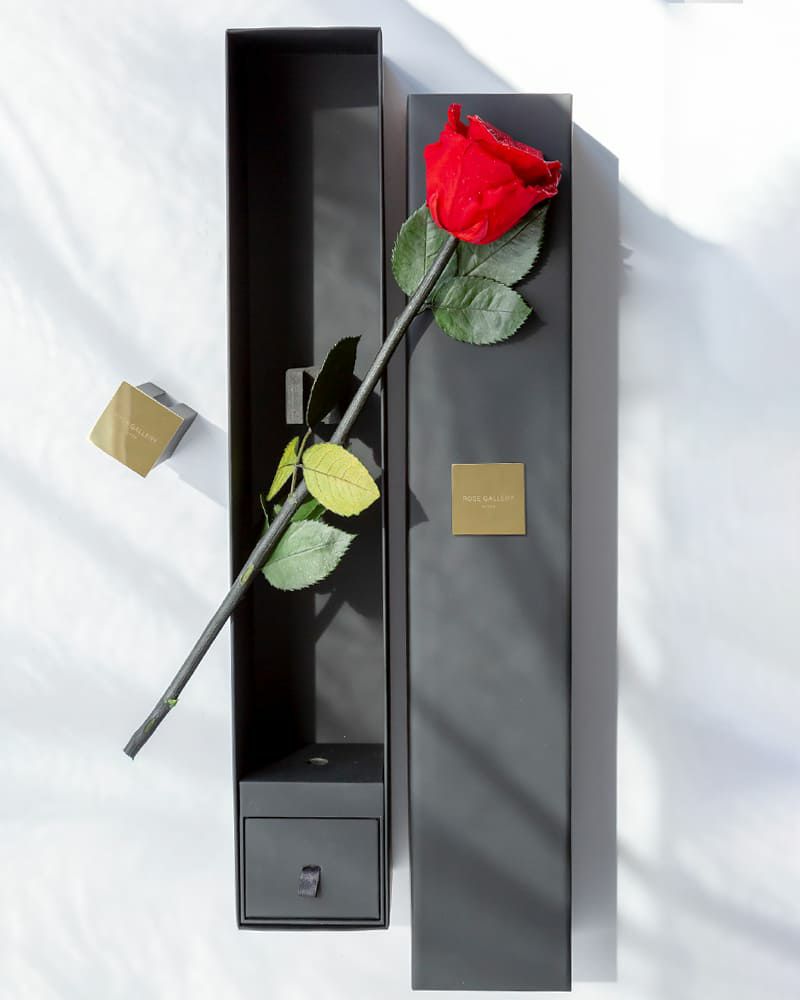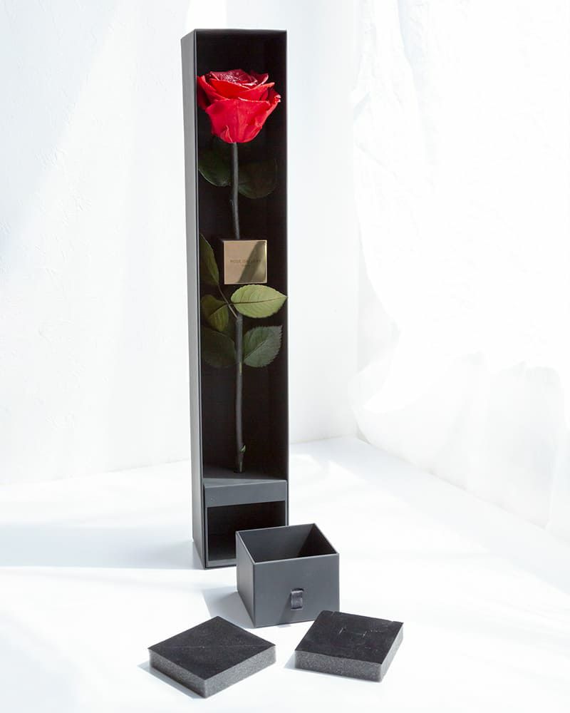 「ROSE GALLERY」のロゴが刻印されたゴールドメッキを施したメタルプレートを蓋の表と、箱の中の2ヶ所に使用しました。内部のメタルプレートは、ローズの茎を保護し固定する“ホルダー”の役目も担っています。簡単に、何度でも取り外しできます。