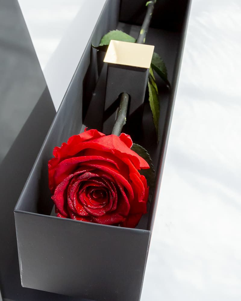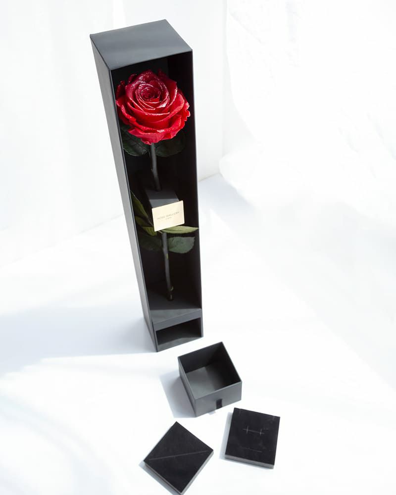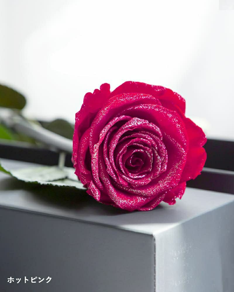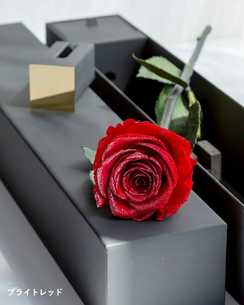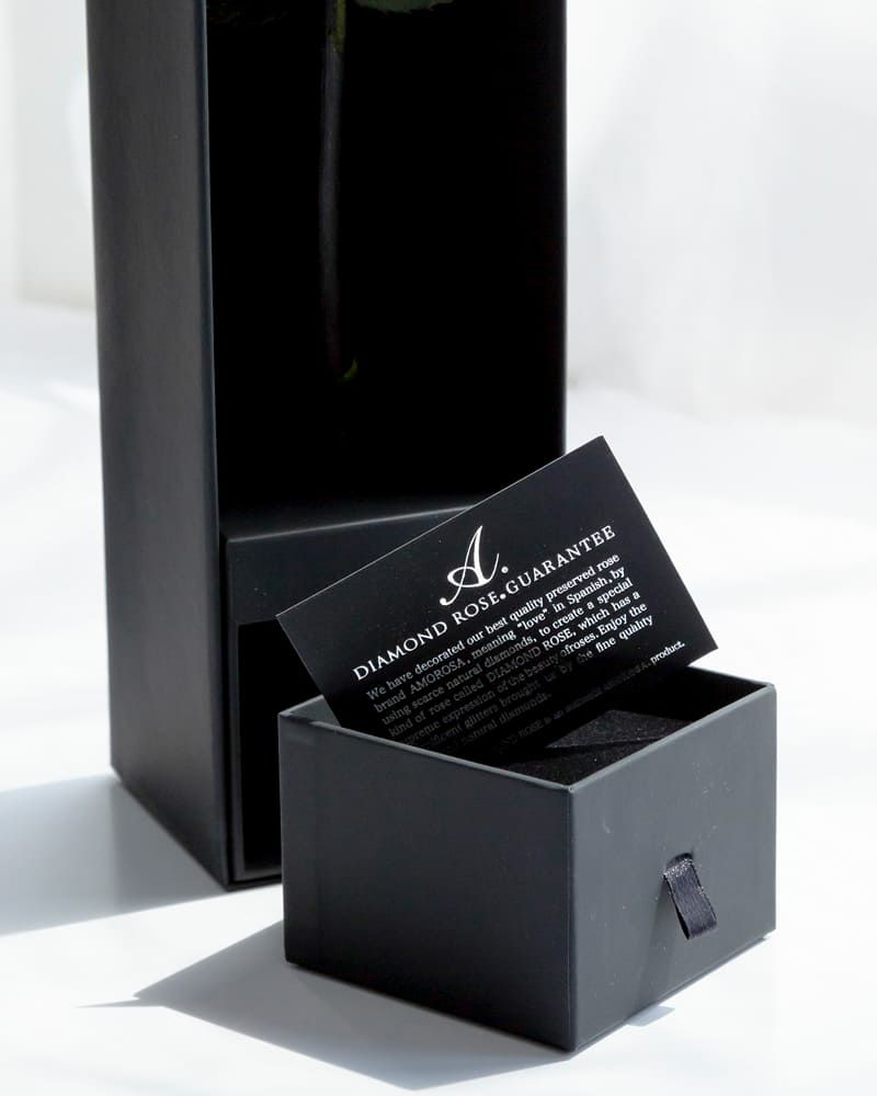 リアルさを追求した太く長いステムに、大輪のダイヤモンドローズを組み合わせました。専用ボックスに取り付けたり、取り外したり、店頭でも何度でも出し入れすることができます。