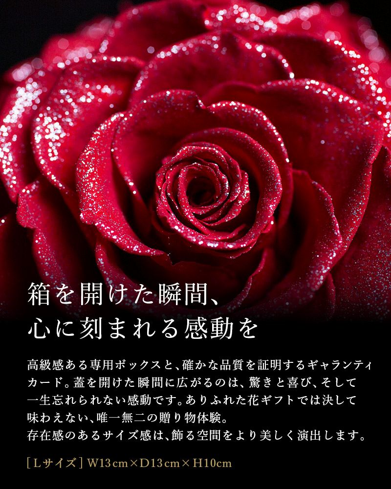部屋に飾るたび、プロポーズや記念日の感動が鮮やかによみがえり、 その一輪は、何年経っても色褪せない愛の証として寄り添い続けます。