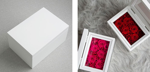 本物のローズとローズペダルを美しく額装したフォトフレーム。左側には、お好きな写真やカードを飾っていただけます。
